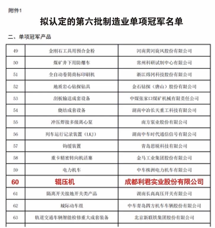 近日,工業(yè)和信息化部發(fā)布了《關(guān)于制造業(yè)單項冠軍第六批遴選和第三批通過復(fù)核企業(yè)名單的公示》,四川省5家企業(yè)上榜第六批制造業(yè)單項冠軍企業(yè)公示名單,成都利君實業(yè)股份有限公司輥壓機(jī)入選制造業(yè)單項冠軍產(chǎn)品名單。